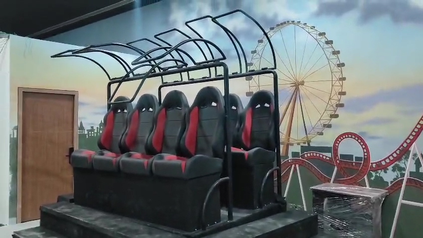 irtual reality headset: Each rider wears a headset, often a compact, mobile VR device. The headset's display presents a virtual environment, such as a futuristic cityscape, a deep space adventure,